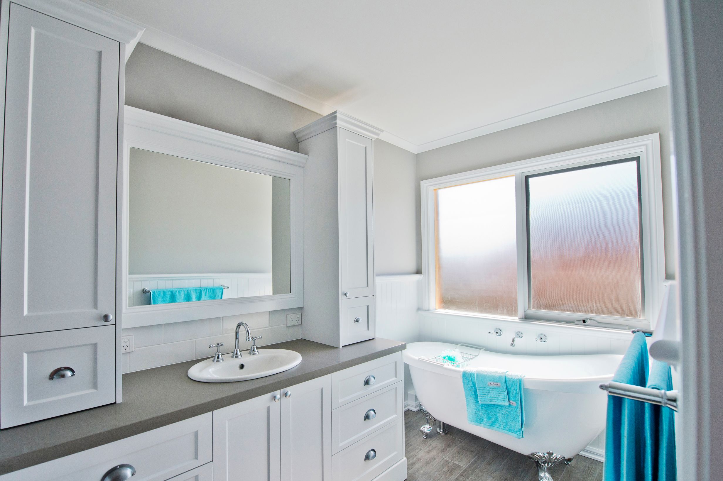 A beautiful, provincial style bathroom was designed with custom-made vanities and wall panelling to achieve this classic look.