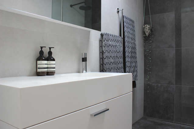 A loft-style bathroom with grey stones designed for a small space.